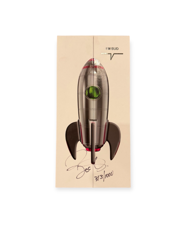 Soft vinyl. BUD is donned with an airtight helmet that has a compartment to hide items. Rechargeable LED lights and magnifying lens to highlight its beauty. 313/1000 signed by the artist.